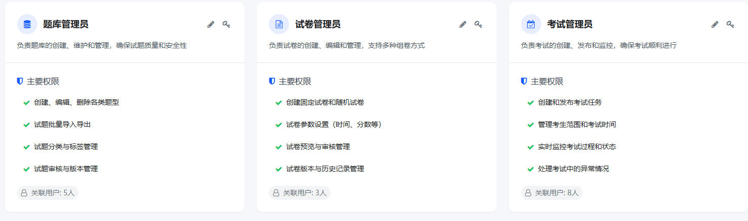 横向分权:题库、试卷、监控、成绩等模块完全独立,题库管理员只能上传编辑试题,无权查看考试监控,人事专员可管考生信息却改不了试卷参数;