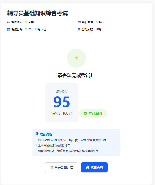 从考前部署到考后评分,宏远考试系统以全流程的高效服务和严苛的公正标准,助力该校辅导员基础知识考试顺利收官。100% 的参考率不仅体现了辅导员们对此次考核的重视,更印证了考试组织工作的严谨有序。校方负责人表示,宏远考试系统的应用的,不仅简化了考试流程、降低了管理成本,更让考核结果具备了更高的可信度,为高校辅导员队伍的规范化建设提供了有力支撑。