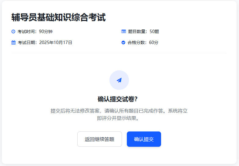 考试过程中,120 分钟的时长设置科学合理,充分保障了辅导员们的答题时间。宏远考试系统稳定的运行状态成为整场考试的 “定心丸”,全程无卡顿、无故障,确保每位考生都能专注于答题。而在评分环节,系统的智能化优势更是展现得淋漓尽致:客观试题实现自动评分,考完即刻生成客观题成绩,不仅省去了人工批改的繁琐流程,更杜绝了人工阅卷可能出现的误差,让评分效率提升数倍;针对主观试题,系统创新设置人工复评功能,且在复评过程中可自动屏蔽考生信息,从技术层面彻底切断 “人情分” 的滋生土壤,确保每一份答卷都能得到公平公正的评判,让考核结果真正反映辅导员的真实水平。