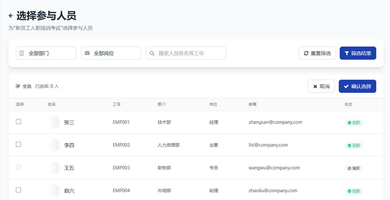 精准度零误差:通过系统自动筛选(排除停用账号、重复人员、不符合条件人员),避免手动筛选的漏选、错选问题,确保培训考试“对人对事”;