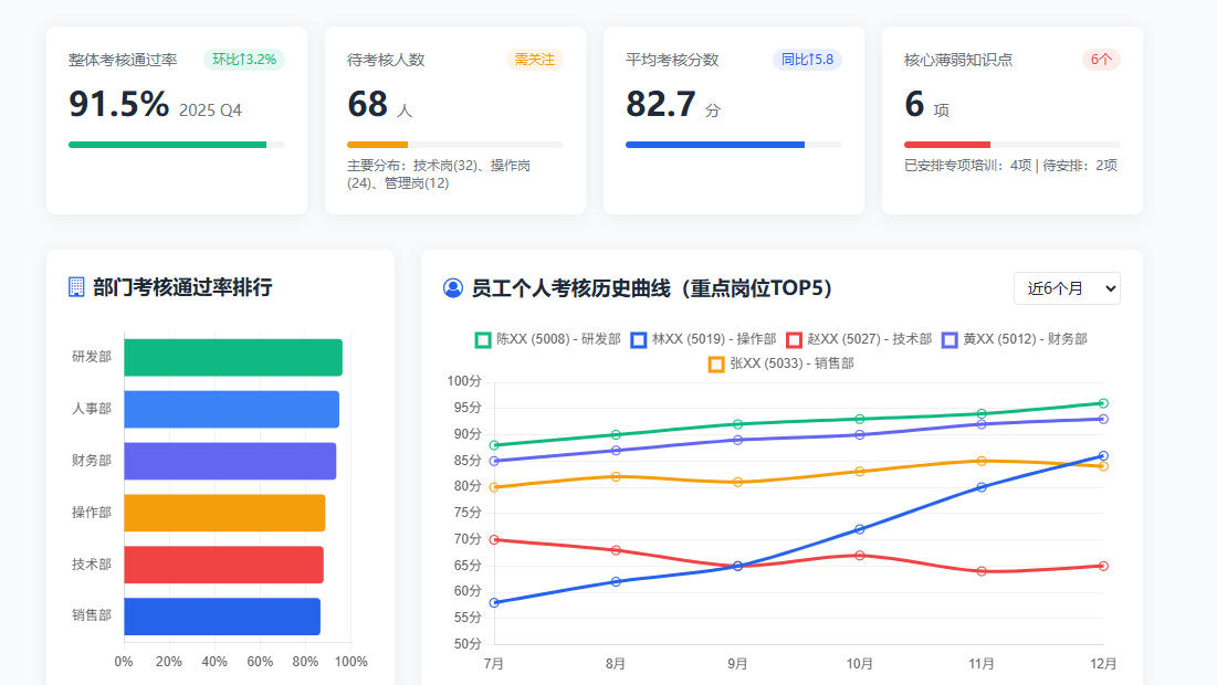 系统自动生成多维度报表,包括部门考核通过率排行、岗位考核薄弱点分析、员工个人考核历史曲线等,通过柱状图、折线图等可视化形式呈现。某压力容器企业通过报表发现,焊接岗位在 “压力管道安全操作” 知识点上通过率仅 68%,立即组织专项培训,次月通过率提升至 92%。