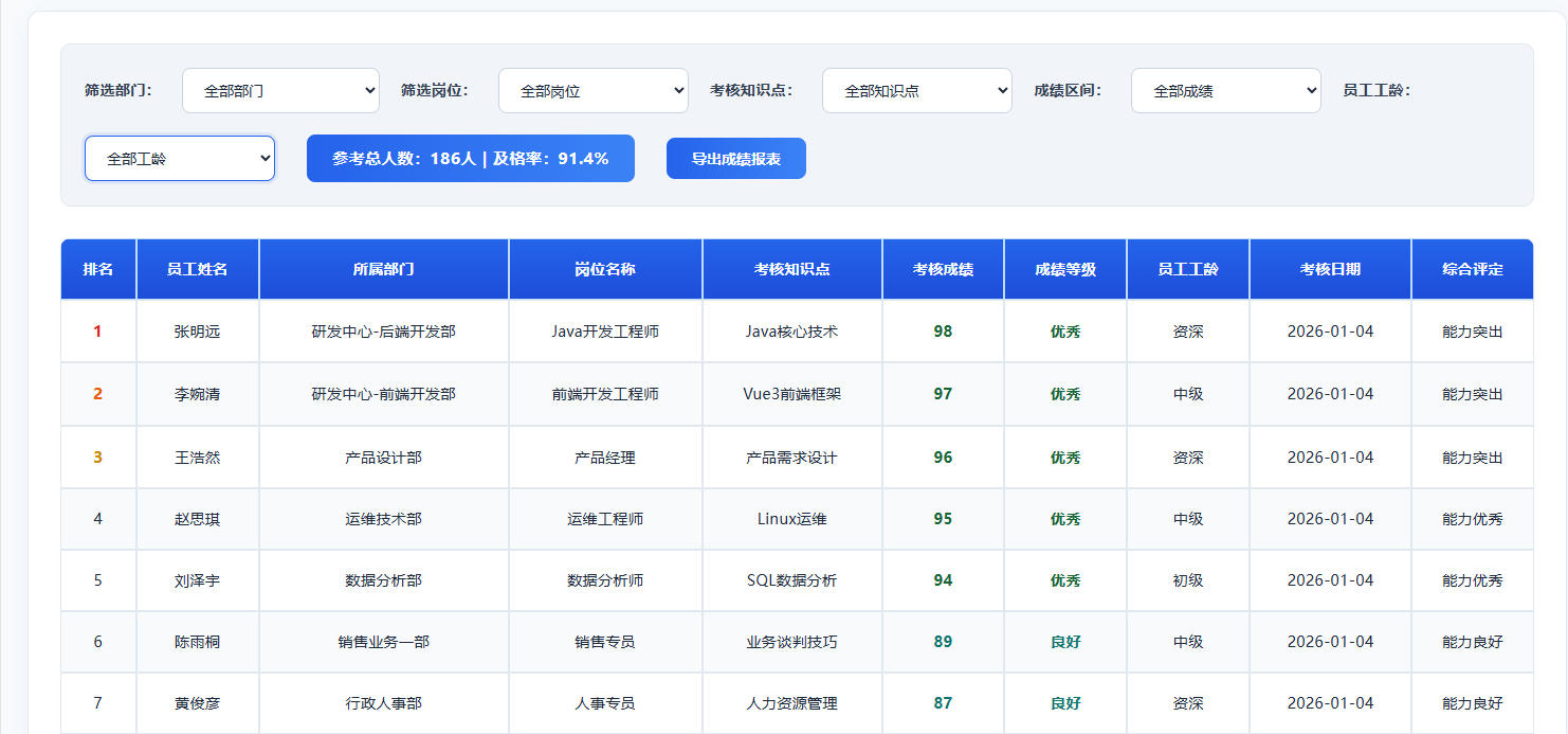 培训的核心目标是提升员工知识技能与岗位适配度,但若无法量化培训效果,就难以判断培训投入的实际价值。宏远培训考试系统的培训效果分析功能,聚焦知识掌握度变化与岗位能力匹配度两大核心维度,通过科学的数据分析模型,实现培训效果的量化评估,为培训体系优化提供精准支撑。