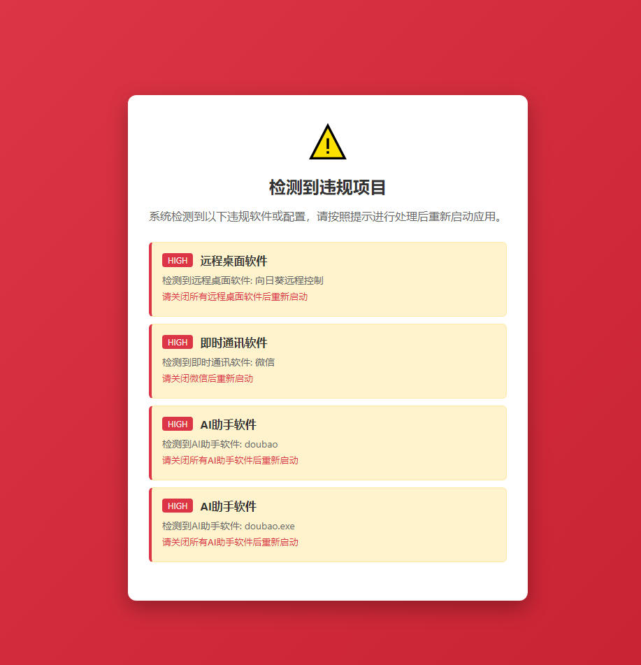 客户端安装完成后,系统将自动启动双重防护机制:一方面,立即触发全屏霸屏状态,彻底锁定考生的操作界面,屏蔽电脑任务栏、快捷键切换、窗口最小化等功能,考生无法在考试过程中切换至其他程序,从操作层面杜绝了通过浏览器打开作弊插件、使用远程控制软件接收外部协助的可能;另一方面,系统将启动全方位的插件检测扫描,针对豆包等AI浮动飘屏插件、向日葵远程控制软件等常见作弊工具,通过进程检测、特征码识别等技术手段,精准排查考生设备中已安装或正在运行的涉嫌作弊插件。