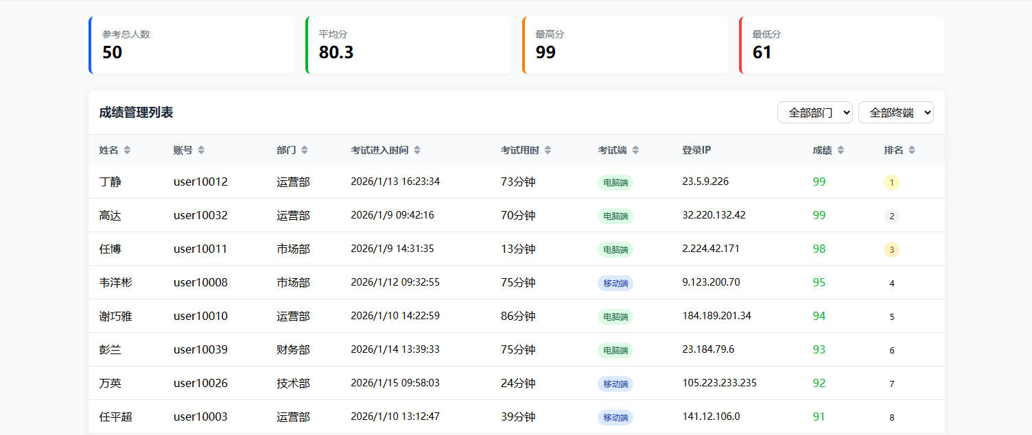 宏远培训考试系统的核心优势之一,在于考试完成后的数据自动统计与结构化呈现。不同于传统纸质考试需人工逐份统计成绩、整理考生信息的低效模式,该系统在考生提交试卷的瞬间,便启动全维度数据采集与整合流程,最终在成绩管理模块形成清晰规范的成绩列表,实现“考后即出数”的高效体验。这份成绩单列表涵盖企业培训考核所需的全量关键信息,具体包括考生姓名、登录账号、所属部门、岗位职级、考试进入时间、总答题时长、登录设备类型(精准区分移动端、电脑端)、登录IP地址、最终考试成绩、当前考试排名等核心字段,让每一位考生的考试情况都清晰可追溯。